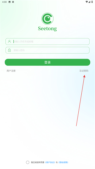 1、啟動(dòng)手機(jī)遠(yuǎn)程監(jiān)控的APP,進(jìn)入時(shí)點(diǎn)擊右側(cè)忘記密碼。