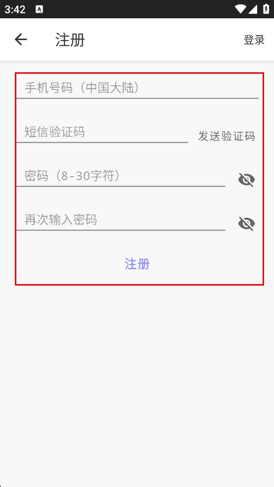 3、在注冊(cè)頁(yè)面輸入手機(jī)號(hào)碼,點(diǎn)擊“發(fā)送驗(yàn)證碼”并輸入,設(shè)置8-30字符的密碼并再次輸入。