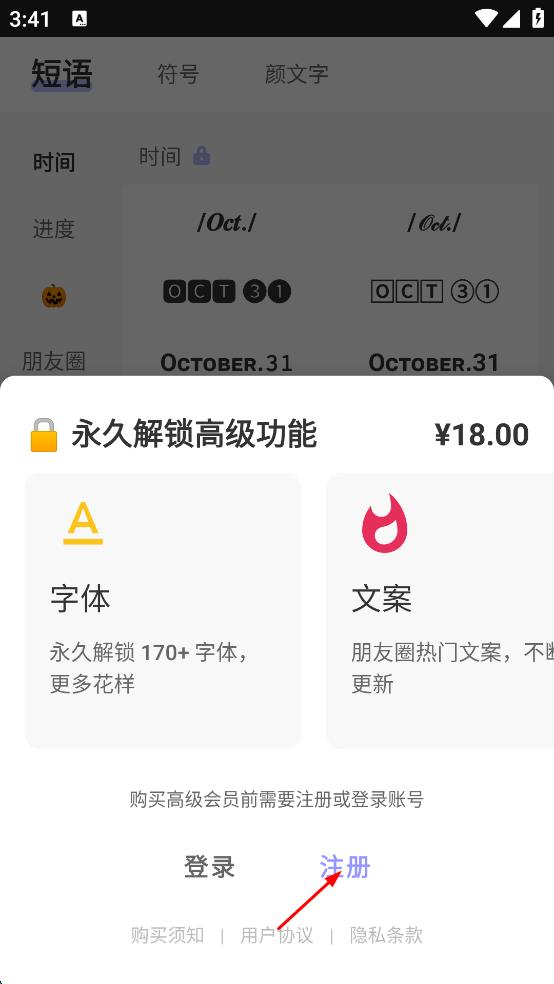 2、在詞典頁(yè)面點(diǎn)擊需解鎖的內(nèi)容,彈出注冊(cè)提示后點(diǎn)擊“注冊(cè)”。