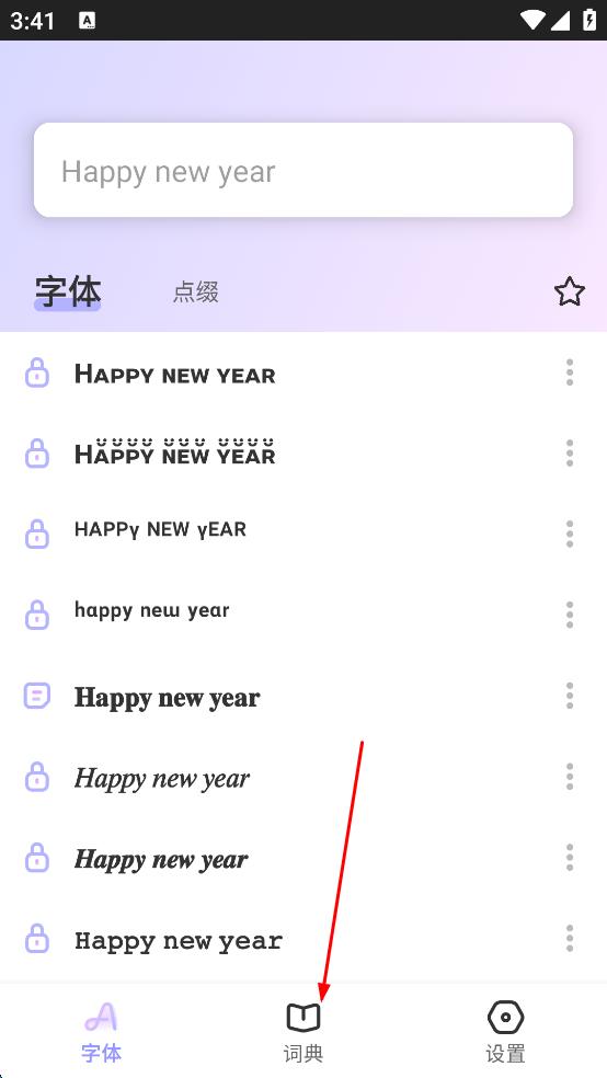 1、打開(kāi)字體設(shè)計(jì)類(lèi)軟件,點(diǎn)擊底部“詞典”進(jìn)入詞典頁(yè)面。