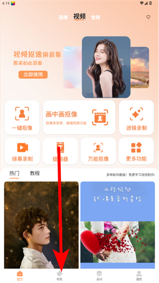 1、打開視頻摳像應用,點擊底部特效選項,進入特效選擇界面。