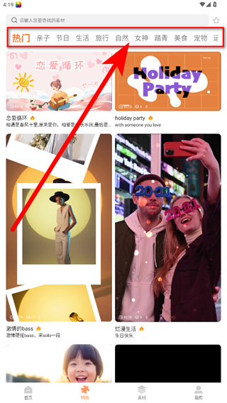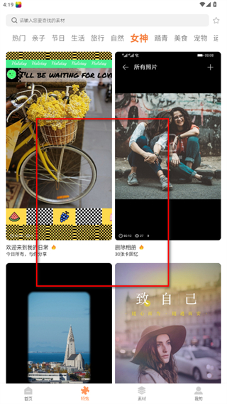 2、在特效界面中,選擇分類標簽,如女神,然后挑選喜歡的特效模板。