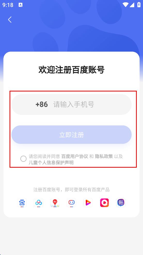 4、在注冊百度賬號頁面,輸入手機號,勾選相關協(xié)議,點擊“立即注冊”按鈕完成注冊,之后可登錄使用。