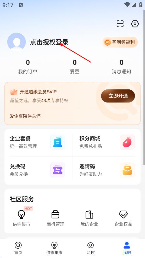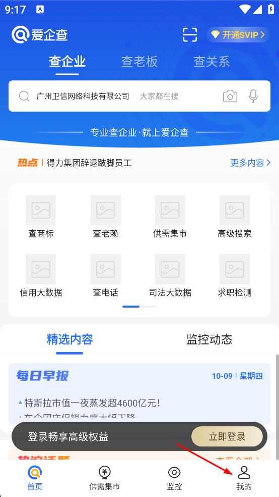 1、打開愛企查APP,進入后在主界面找到右下角“我的”選項并點擊,進入個人頁面。