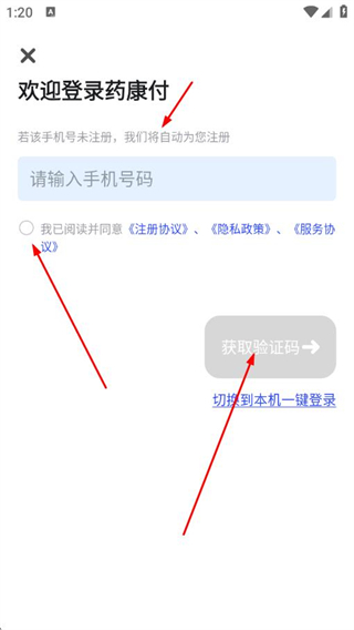 3、在登錄頁面輸入手機(jī)號(hào)碼,勾選協(xié)議,點(diǎn)擊獲取驗(yàn)證碼。