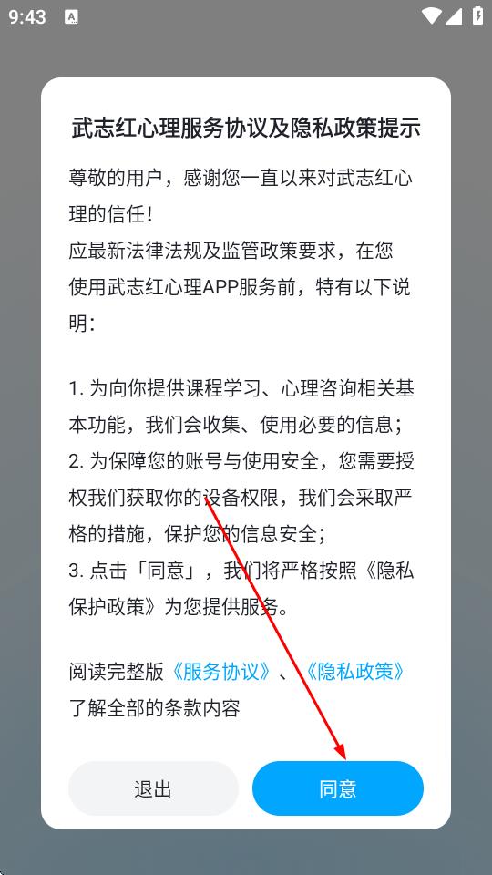 1、打開武志紅心理APP,在彈出的武志紅心理服務(wù)協(xié)議及隱私政策提示頁面,點(diǎn)擊同意。