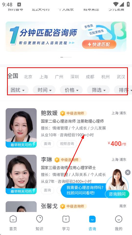 3、在咨詢頁面,可以通過地區(qū)、困擾類型、時(shí)間、價(jià)格等條件篩選心理咨詢師,找到合適的咨詢師。