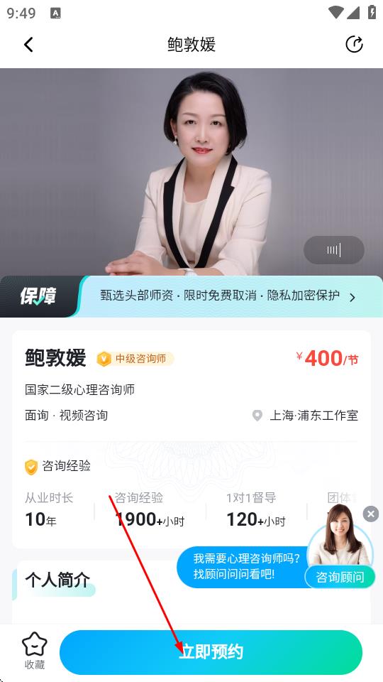 4、點(diǎn)擊選中的咨詢師,進(jìn)入咨詢師詳情頁面,查看其資質(zhì)、擅長領(lǐng)域、咨詢經(jīng)驗(yàn)等信息,點(diǎn)擊立即預(yù)約,完成預(yù)約流程。