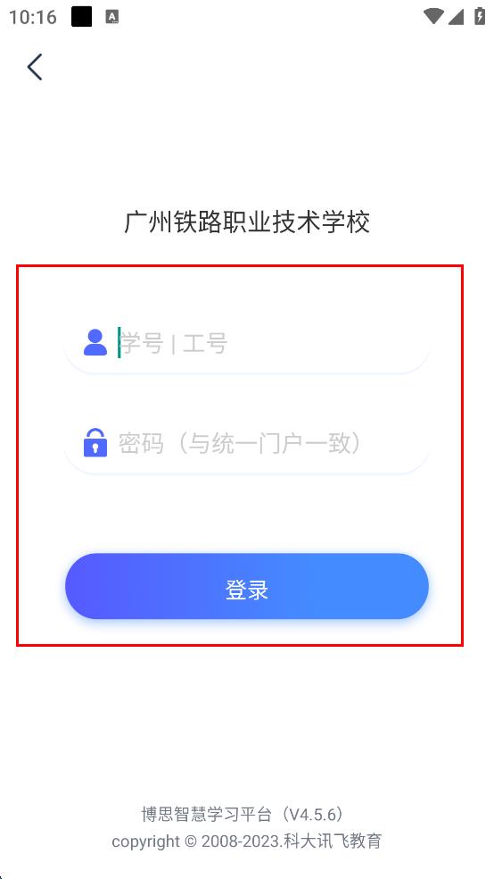 4、在院校登錄頁面,依次輸入學號或工號以及與統(tǒng)一門戶一致的密碼,點擊登錄按鈕。