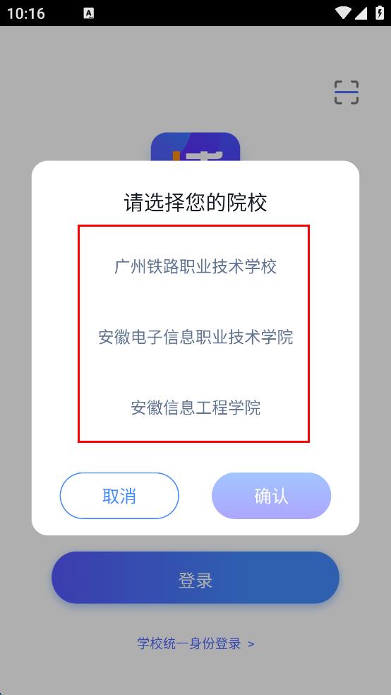 3、在請選擇您的院校彈窗里,選擇對應的院校,點擊確認按鈕,進入院校登錄頁面。
