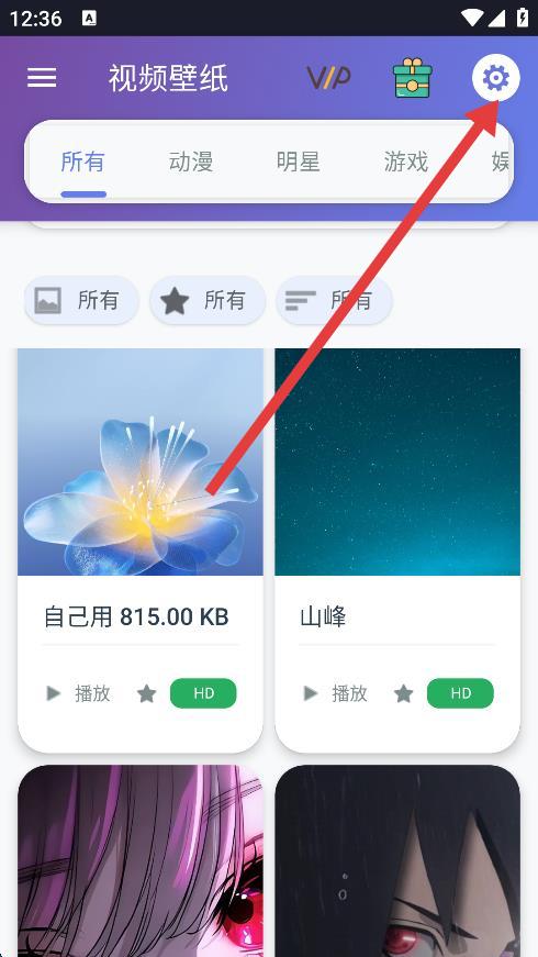 1、打開安果視頻壁紙App,點擊右上角的齒輪狀設(shè)置圖標(biāo)。