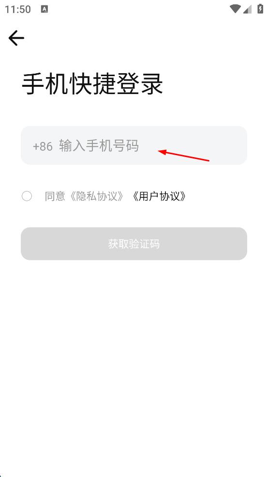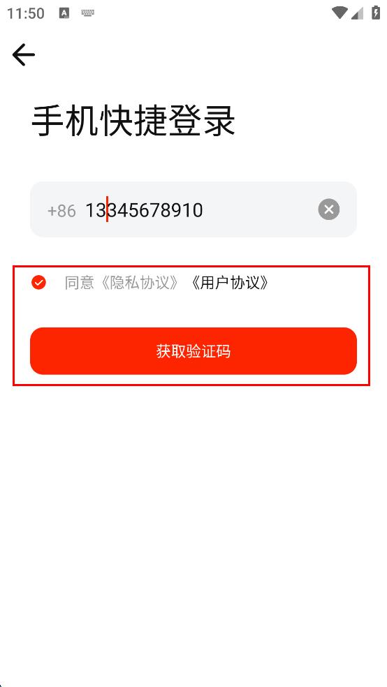 4、填寫(xiě)好手機(jī)號(hào)碼后,勾選同意隱私協(xié)議,用戶協(xié)議,然后點(diǎn)擊“獲取驗(yàn)證碼”按鈕,等待接收驗(yàn)證碼,后續(xù)輸入驗(yàn)證碼即可完成登錄。