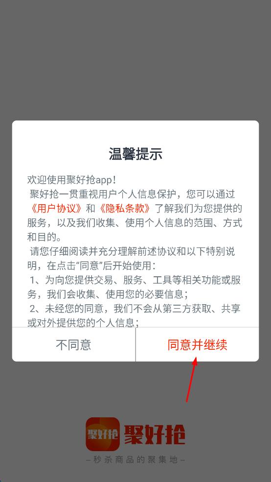 1、打開(kāi)聚好搶app,會(huì)彈出溫馨提示頁(yè)面,提示可通過(guò)用戶協(xié)議和隱私條款了解服務(wù)及個(gè)人信息相關(guān)情況,仔細(xì)閱讀后,若同意,點(diǎn)擊“同意并繼續(xù)”按鈕。