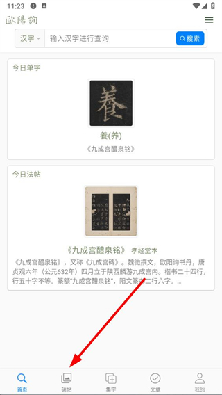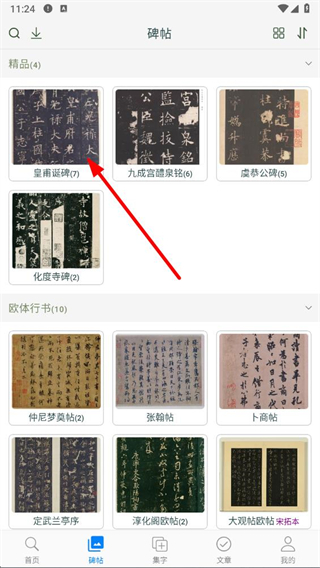 1、打開歐陽詢書法字典app,點(diǎn)擊底部導(dǎo)航欄中的碑帖選項(xiàng),進(jìn)入碑帖瀏覽頁面。