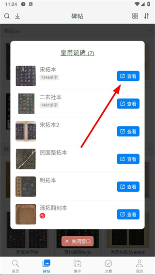 3、點(diǎn)擊后會彈出碑帖版本選擇窗口,選擇要查看的碑帖版本,點(diǎn)擊其對應(yīng)的查看按鈕。