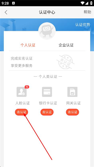 3、在認(rèn)證中心的個(gè)人認(rèn)證板塊下,選擇人臉認(rèn)證并點(diǎn)擊去認(rèn)證。