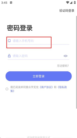 2、在密碼登錄頁面,點(diǎn)擊輸入框,輸入手機(jī)號(hào)碼。