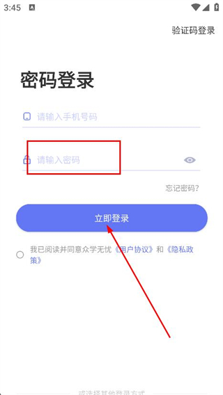 1、打開眾學(xué)無憂APP,點(diǎn)擊右上角的密碼登錄選項(xiàng)。