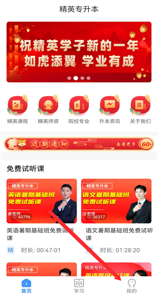 1、在精英專升本的首頁,點擊底部我的按鈕,進入個人頁面。