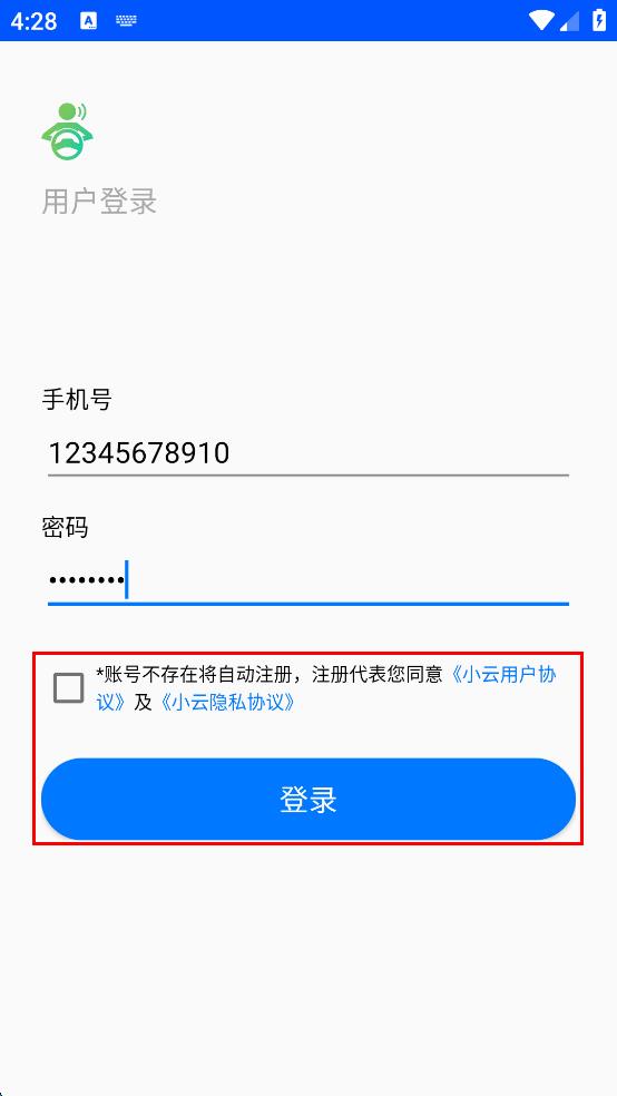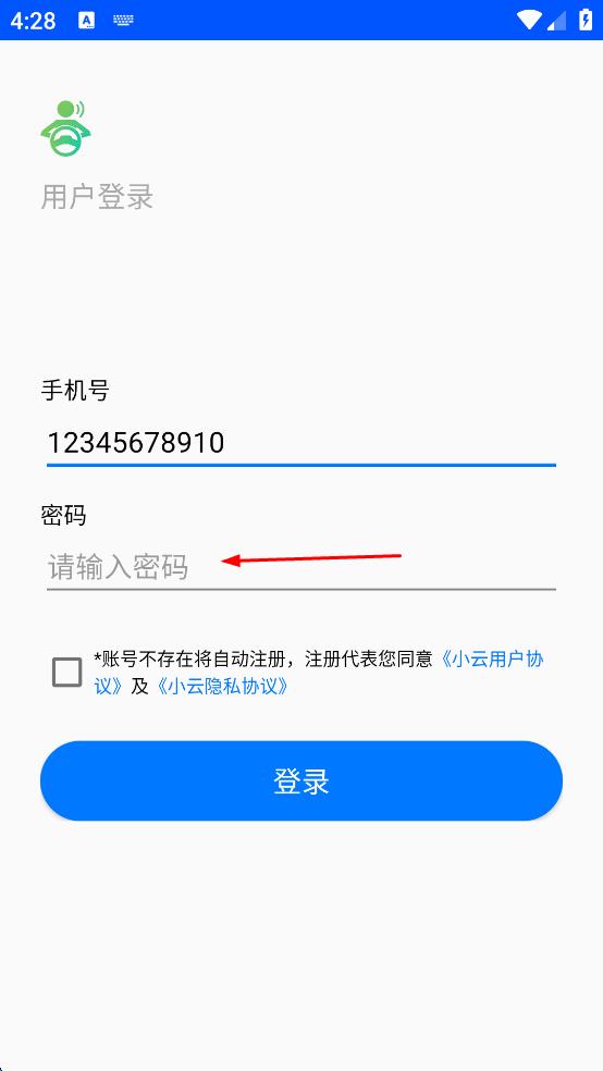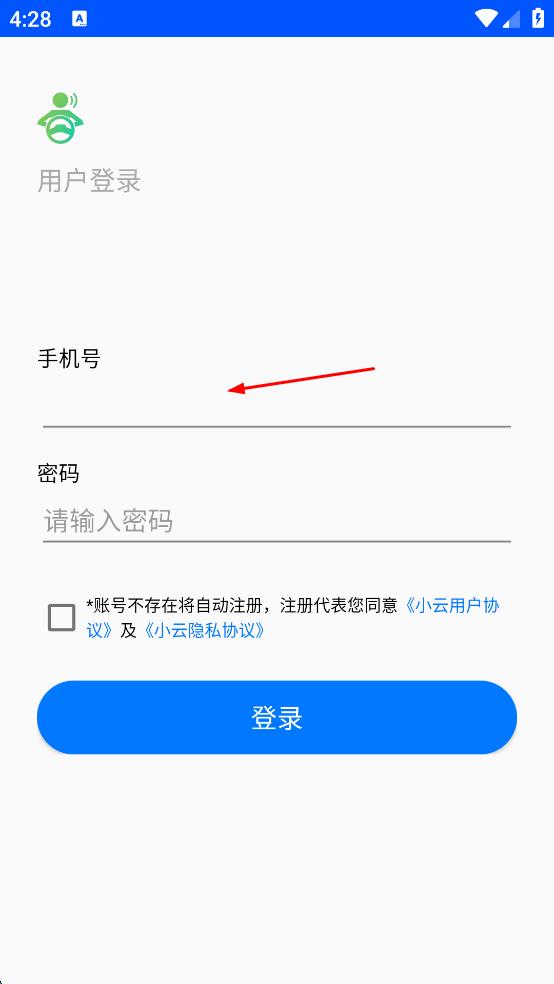 4、勾選賬號(hào)不存在將自動(dòng)注冊(cè),注冊(cè)代表您同意小云用戶協(xié)議及小云隱私協(xié)議,點(diǎn)擊登錄。