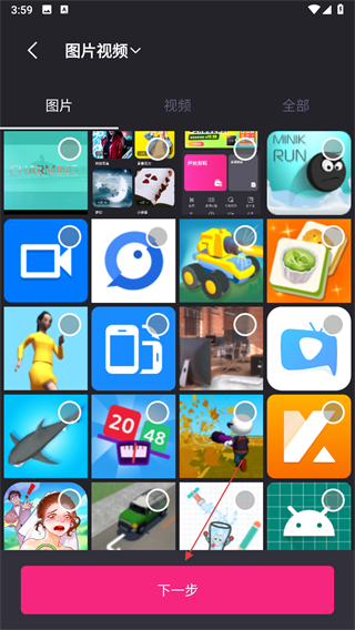 4、在素材選擇界面,勾選需要用到的圖片或視頻素材,然后點擊下一步,進(jìn)入主題編輯頁面。