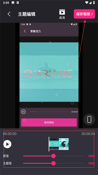 5、在主題編輯頁面,可對原音、主題音等參數(shù)進(jìn)行調(diào)整,完成后點擊右上角的保存視頻按鈕,導(dǎo)出剪輯好的視頻。