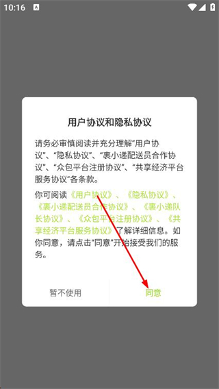 1、打開裹小遞配送員,在彈出的窗口中,點擊同意按鈕。
