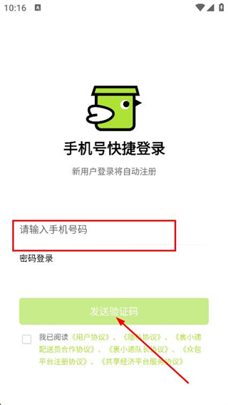 2、進(jìn)入登錄頁面,輸入手機(jī)號碼,點擊發(fā)送驗證碼按鈕。