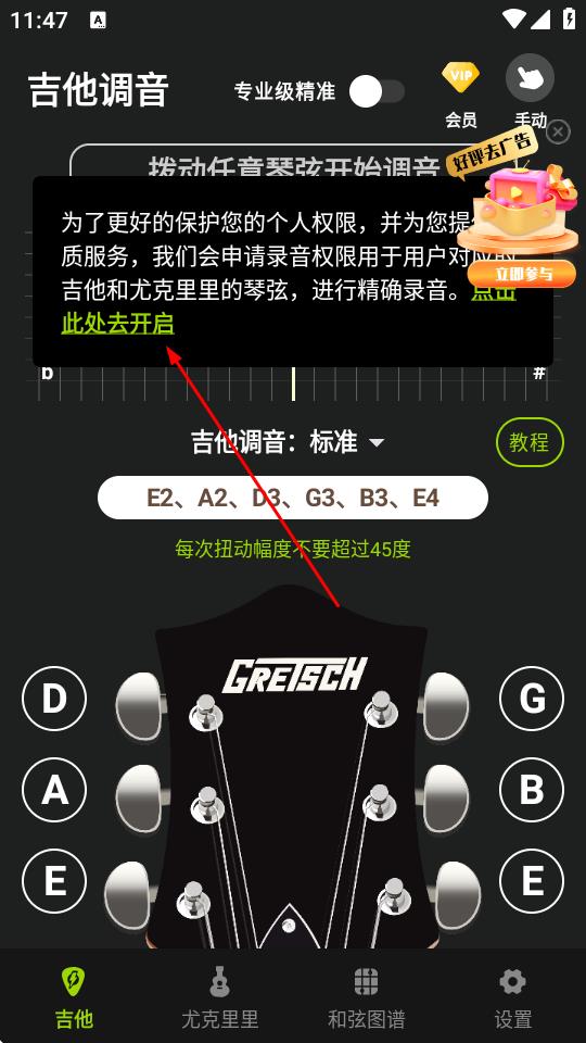 1、打開(kāi)吉他調(diào)音器APP,進(jìn)入吉他調(diào)音界面,點(diǎn)擊提示框中的此處去開(kāi)啟,進(jìn)行錄音權(quán)限開(kāi)啟操作。