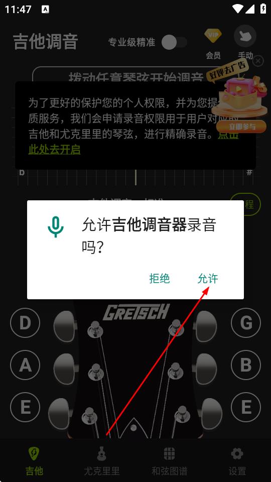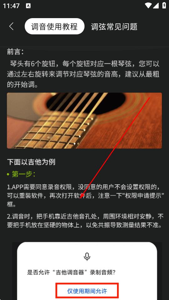 2、在彈出的允許吉他調(diào)音器錄音嗎提示框中,點(diǎn)擊允許,授予APP錄音權(quán)限,以便精準(zhǔn)識(shí)別琴弦聲音。