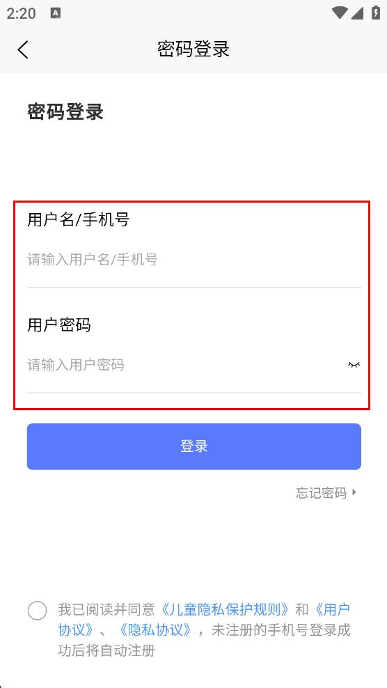 3、在密碼登錄界面,輸入用戶名/手機(jī)號(hào)和用戶密碼。