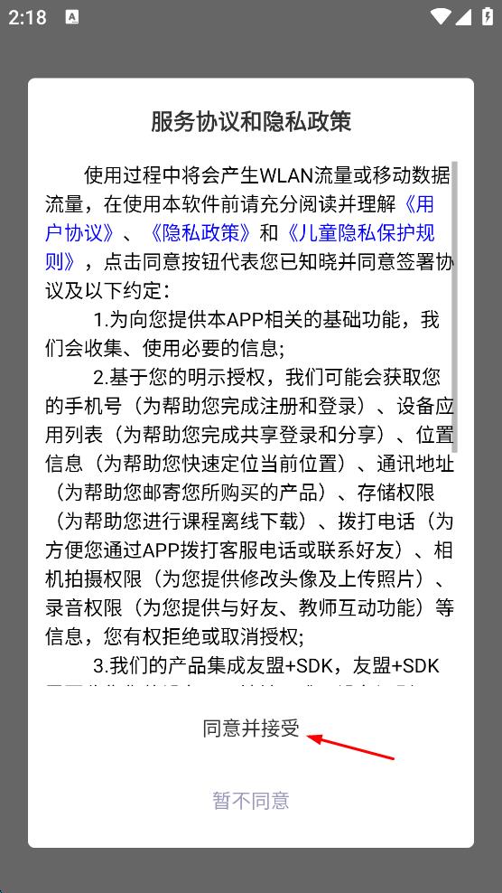 1、打開(kāi)新華智慧校園App,在服務(wù)協(xié)議和隱私政策頁(yè)面,點(diǎn)擊“同意并接受”按鈕。