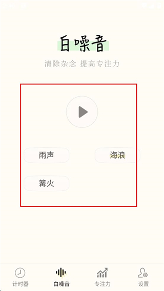 4、在白噪音頁(yè)面,可選擇雨聲、海浪、篝火等白噪音類型,點(diǎn)擊播放按鈕即可播放。