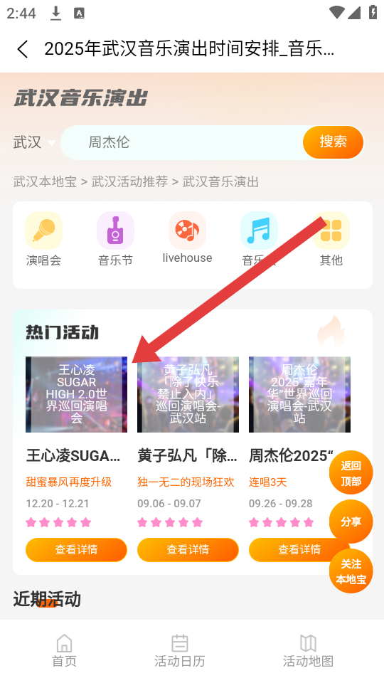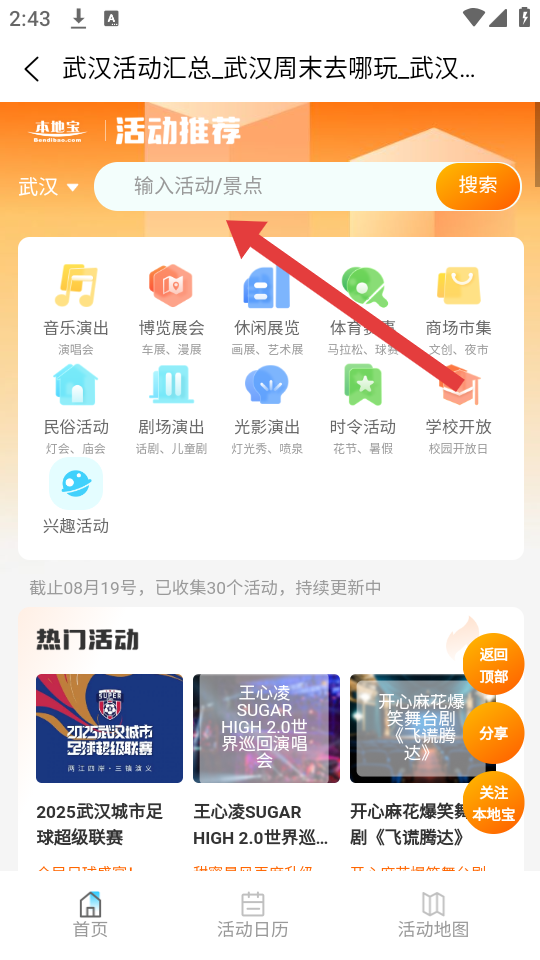 1、打開武漢本地寶,在首頁(yè)點(diǎn)擊活動(dòng)攻略圖標(biāo),進(jìn)入活動(dòng)專題頁(yè)面,開啟演唱會(huì)信息查詢流程。