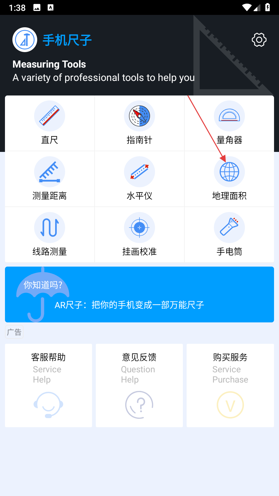 1、打開手機(jī)尺子應(yīng)用,在功能列表里點(diǎn)擊地理面積選項(xiàng),進(jìn)入地理面積測量界面。
