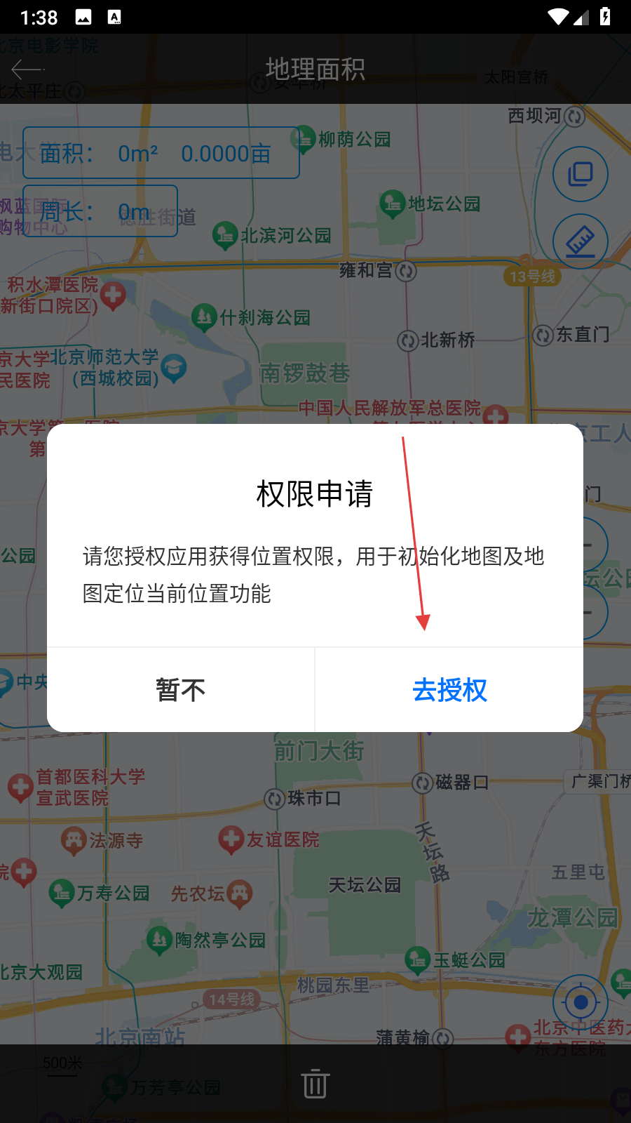 2、進(jìn)入界面后,若彈出權(quán)限申請?zhí)崾究颍c(diǎn)擊去授權(quán)按鈕,授予應(yīng)用位置權(quán)限。