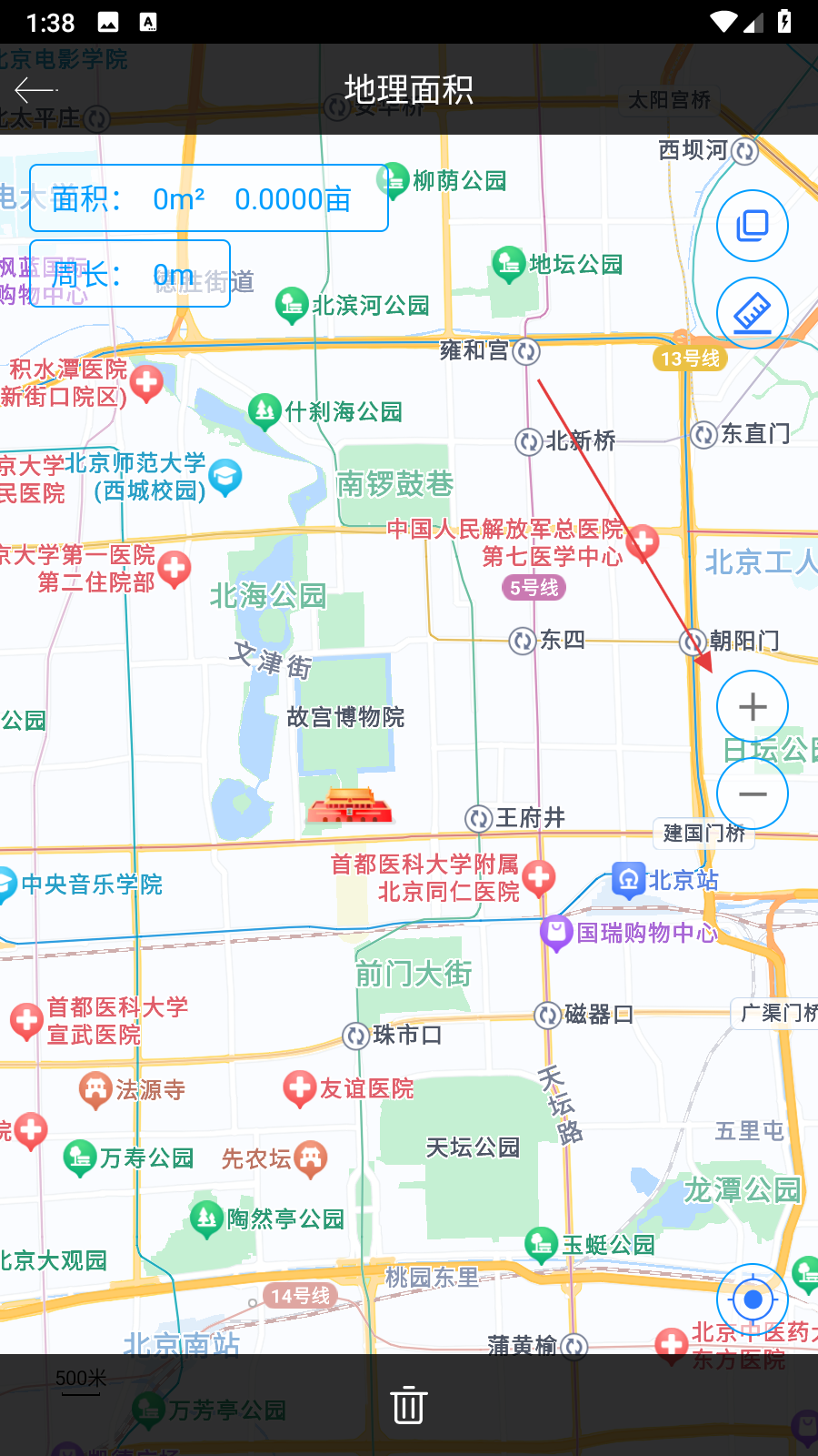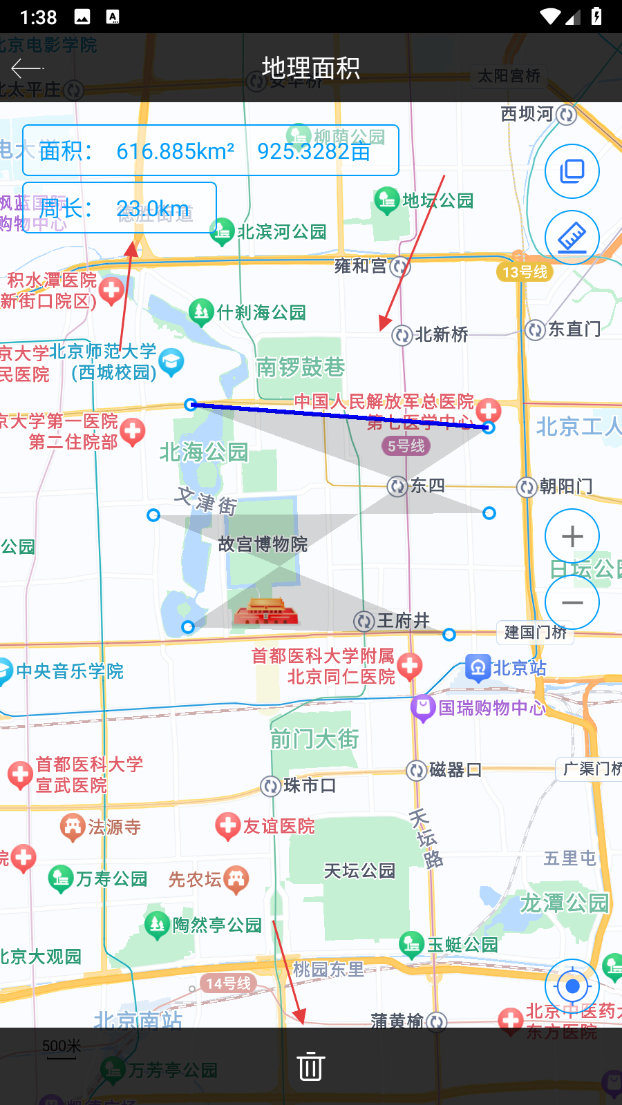 4、在地圖上依次點(diǎn)擊選取該區(qū)域的邊界點(diǎn),應(yīng)用會自動計(jì)算并顯示所選區(qū)域的面積和周長,若測量有誤,點(diǎn)擊底部垃圾桶圖標(biāo)可清除點(diǎn)位重新測量。