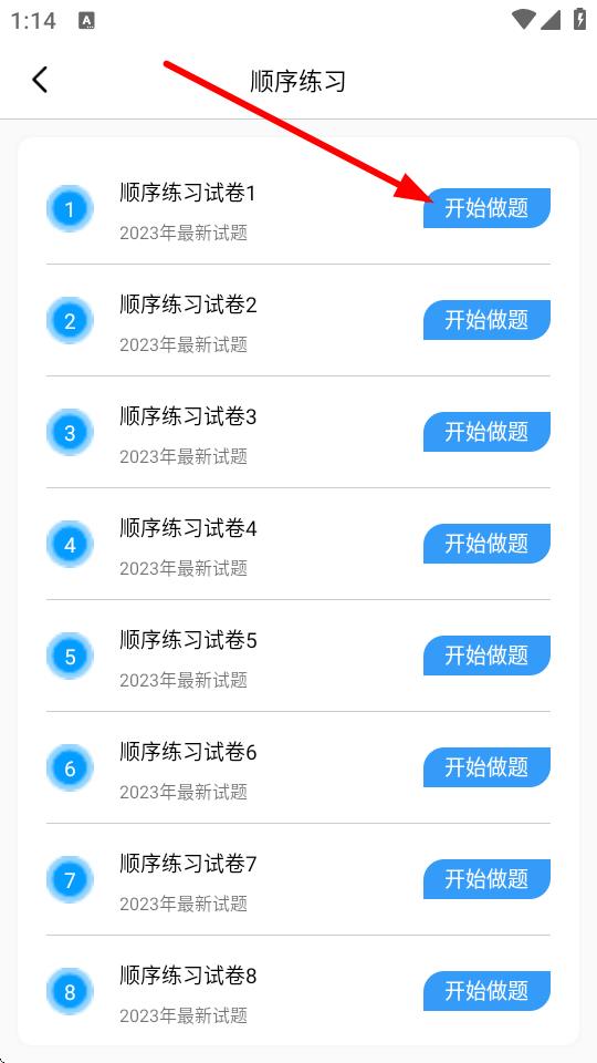 1、在APP主界面,點(diǎn)擊順序練習(xí),進(jìn)入順序練習(xí)試卷列表界面。
