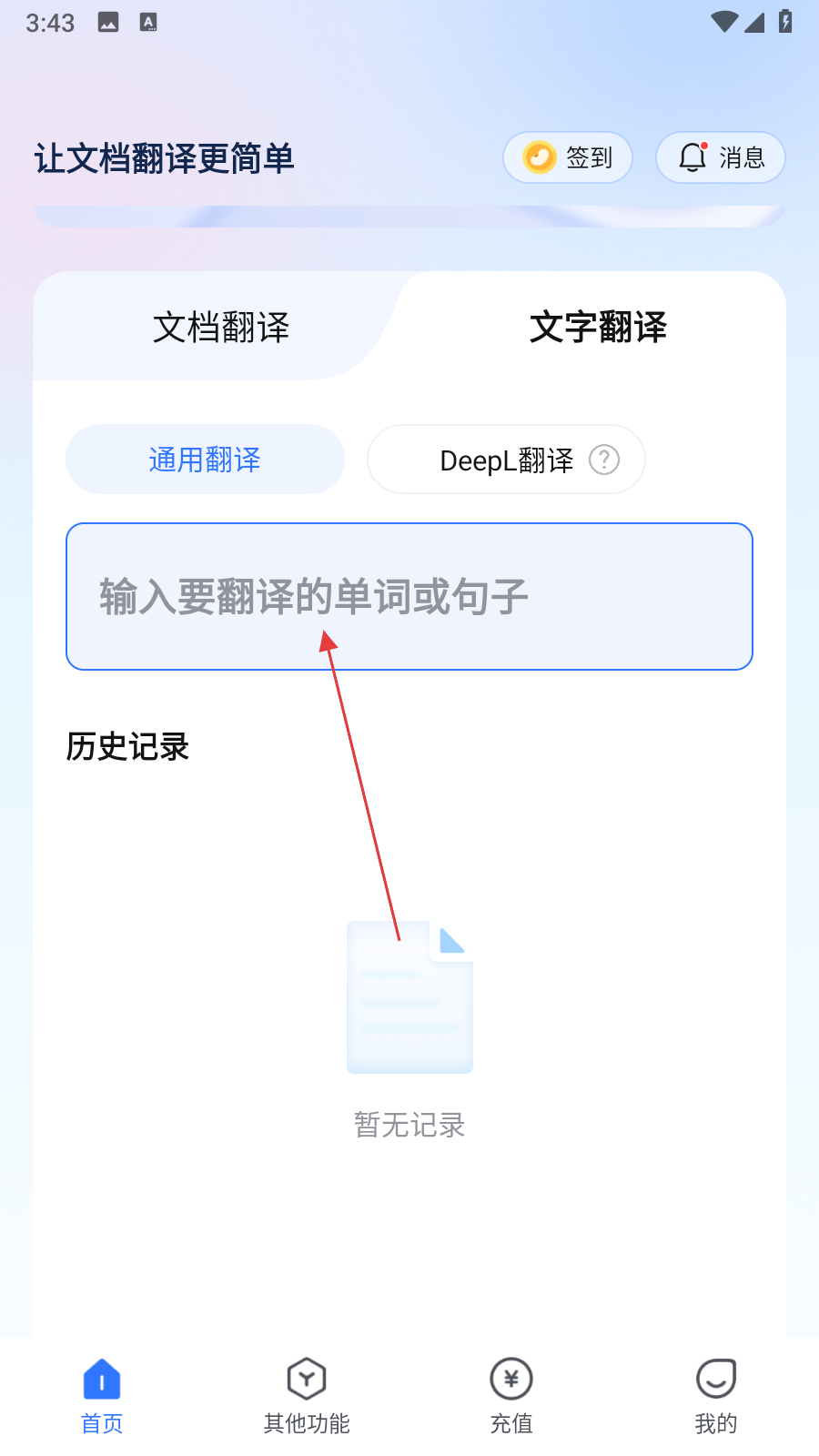 1、打開翻譯類應(yīng)用,進(jìn)入文字翻譯界面,點(diǎn)擊輸入框準(zhǔn)備輸入內(nèi)容。