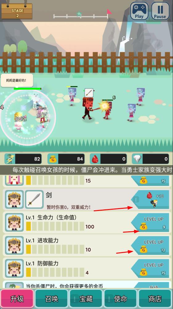 1、進入游戲關卡,操控角色與怪物戰(zhàn)斗,利用下方技能與升級選項,提升戰(zhàn)力,應對不同怪物進攻 。