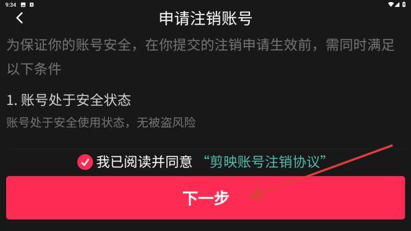 4、在申請注銷賬號的頁面內(nèi),勾選我已閱讀并同意注銷協(xié)議,再點擊下一步即可。