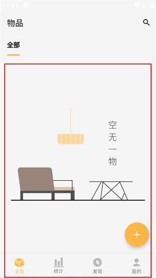 4、登錄后進(jìn)入主頁,可點(diǎn)擊右下角黃色加號按鈕添加物品,也可查看統(tǒng)計、發(fā)現(xiàn)等功能頁面。