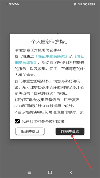 1、打開(kāi)簡(jiǎn)記事APP,進(jìn)入時(shí)會(huì)彈出個(gè)人信息保護(hù)指引,點(diǎn)擊同意并繼續(xù)的按鈕。