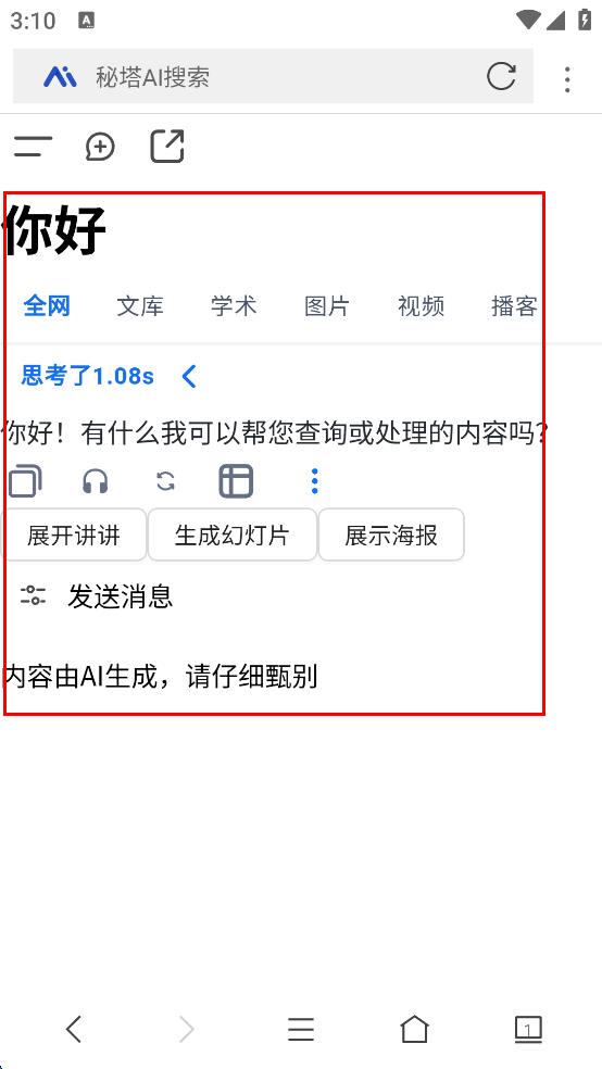 2、在搜索欄中,選擇秘塔AI搜索,輸入“你好”并搜索。