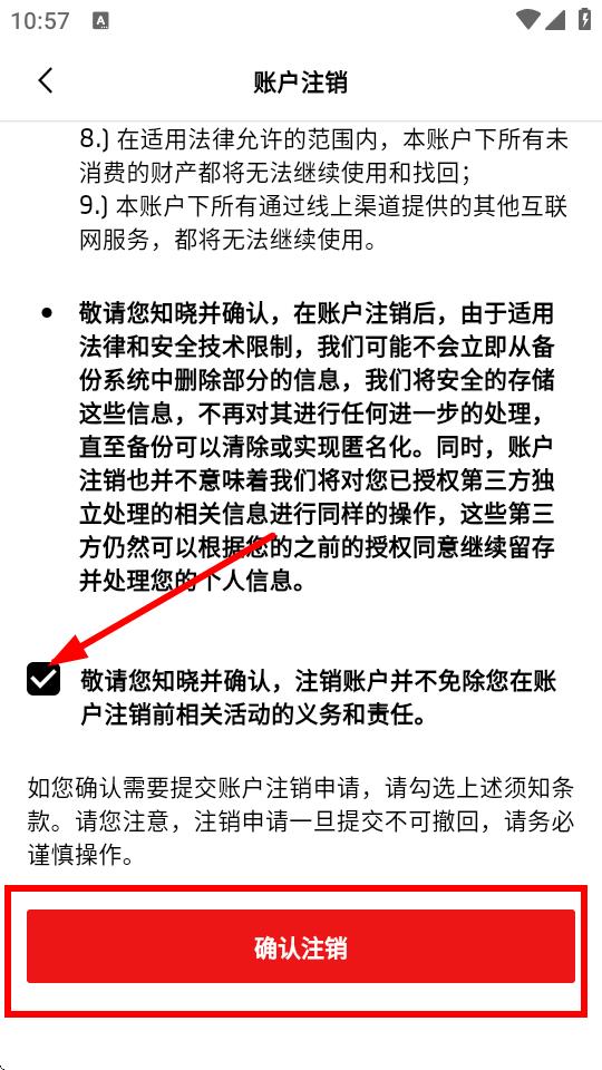 5、仔細閱讀賬戶注銷的相關(guān)提醒和條款,勾選同意相關(guān)須知后,點擊確認注銷,按照后續(xù)提示完成注銷操作。