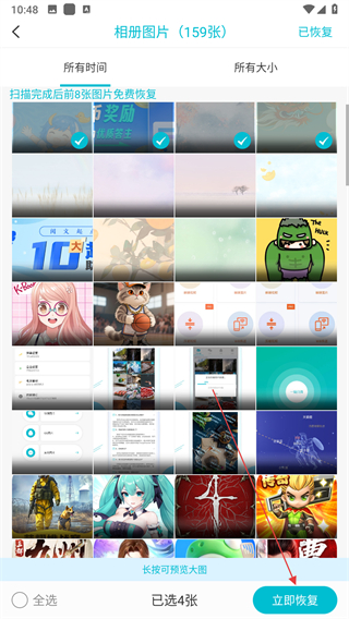 3、在相冊照片界面,瀏覽顯示的圖片縮略圖,勾選需要恢復的照片,選好后點擊立即恢復。