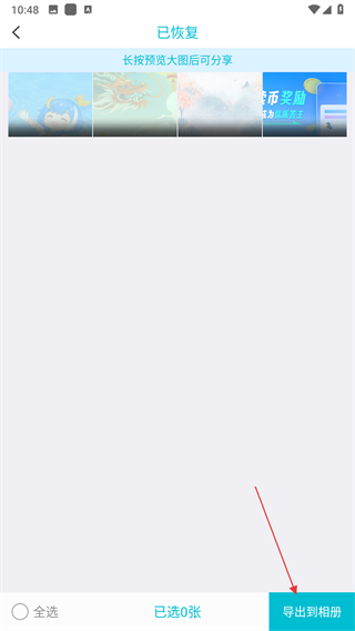 4、恢復完成后,進入已恢復頁面,確認照片恢復成功,然后點擊導出到相冊按鈕。