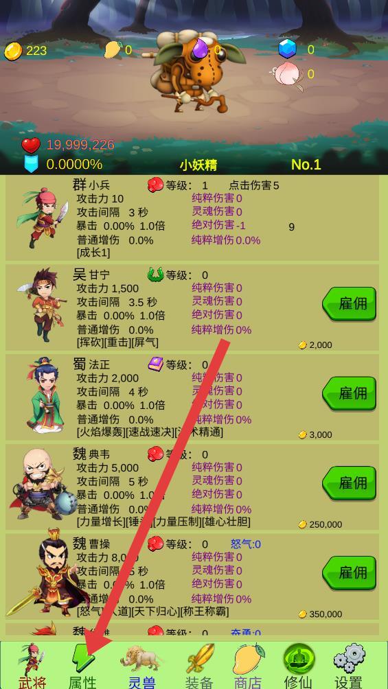 1、在游戲主頁面,點(diǎn)擊下方的屬性選項(xiàng)。