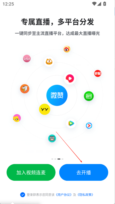 1、首先打開下載好的微贊APP,進(jìn)入軟件后會有兩個登錄類型選擇,分別是加入視頻連麥和去開播選項(xiàng),用戶根據(jù)自己的需求進(jìn)行登錄;