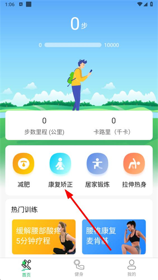 1、打開運動走路計步器app,在首頁找到并點擊康復矯正選項。